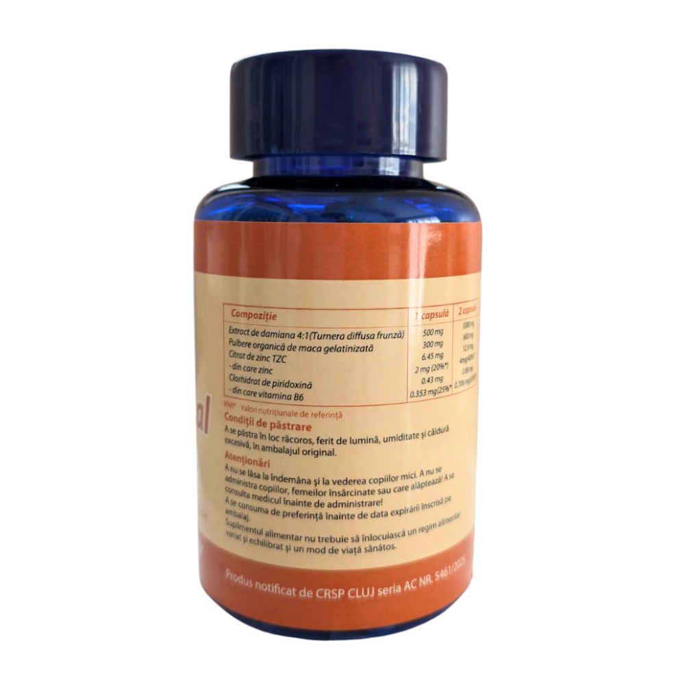Ingrediente: extract de damiana 4:1 (Turnera diffusa, frunză, 500 mg), pulbere ecologică de maca gelatinizată (Lepidium meyenii; 300 mg), citrat de zinc TZC (6,45 mg sau 20% DZR), clorhidrat de piridoxină (vitamina B6; 0,353 mg sau 25% DZR).